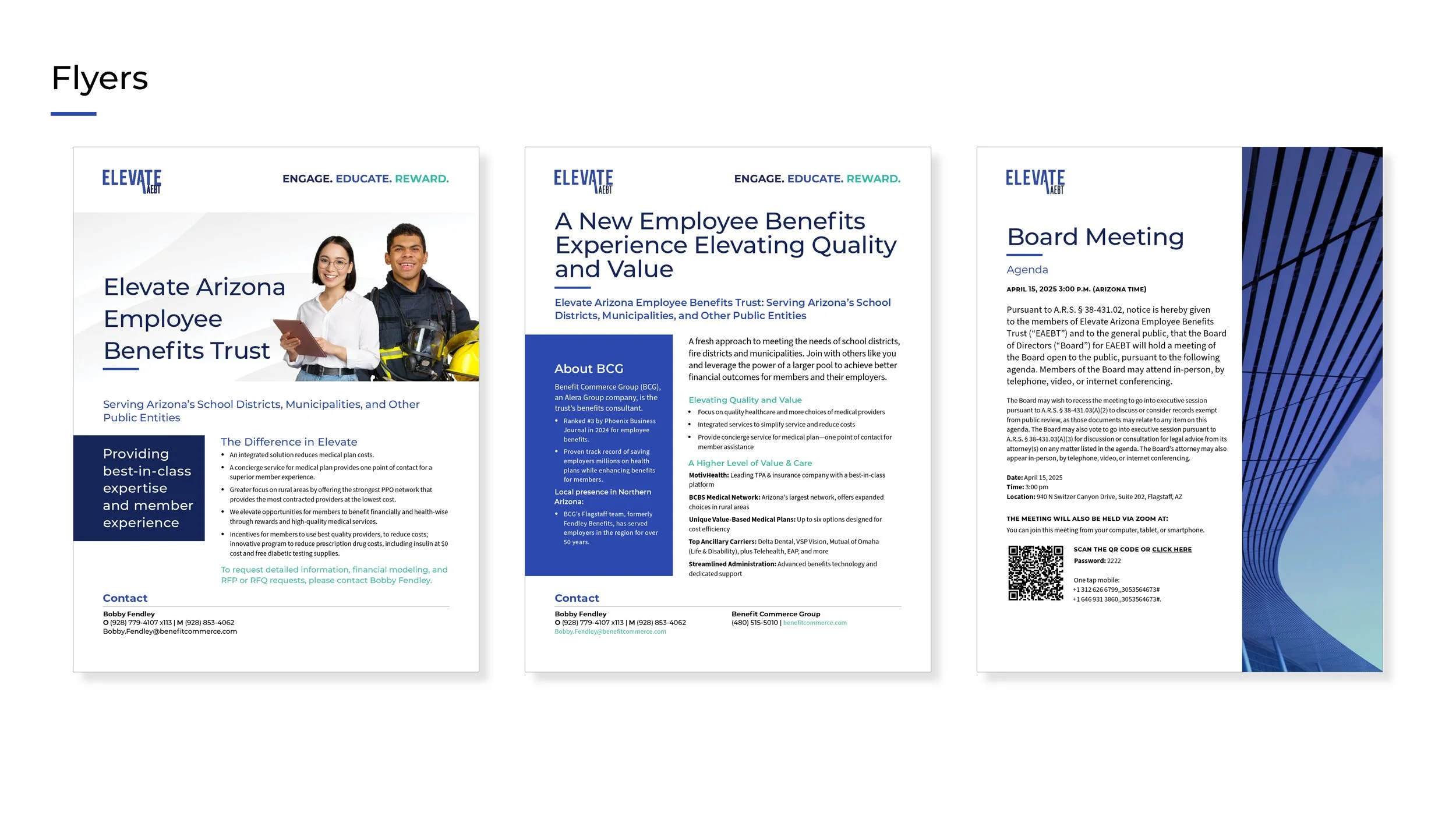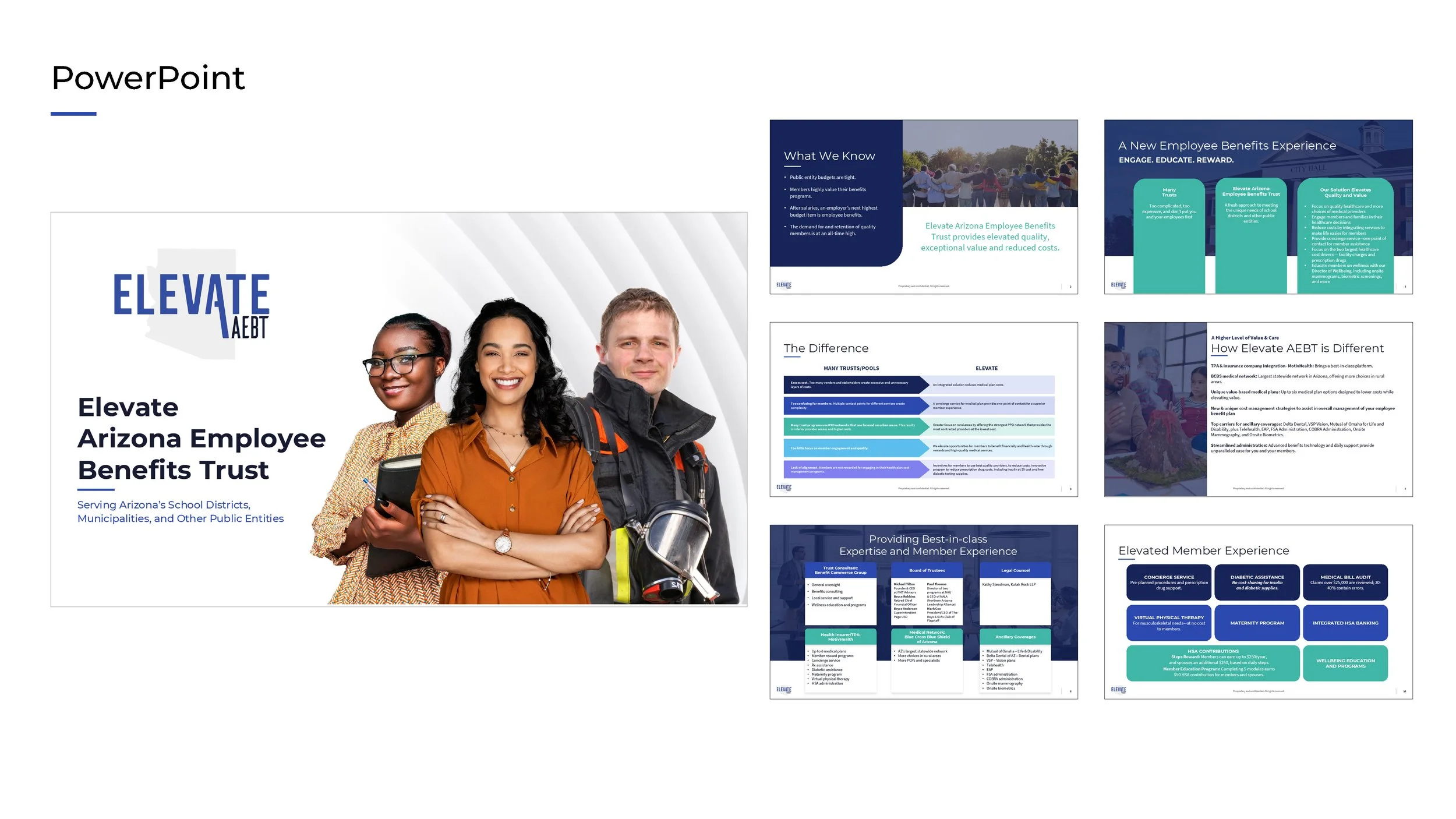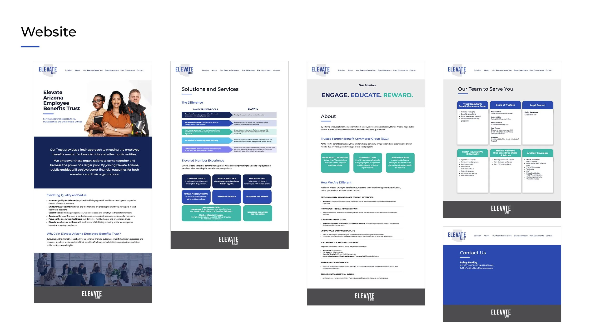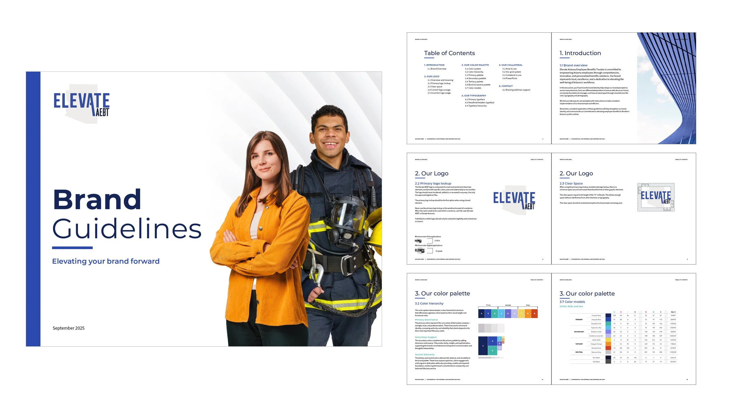 I led the complete brand development for Elevate Arizona Employee Benefits Trustee (Elevate AEBT), crafting a cohesive identity and designing their official website. My work included building out the brand’s visual system—logos, color palettes, and typography—emphasizing trust, integrity, and empowerment. Drawing from the brand guidelines, I created templates and digital collateral that support consistent, professional communications. The website and branding reflect Elevate AEBT’s commitment to excellence in employee benefits, with a refined and approachable style tailored to Arizona’s workforce and public entities.